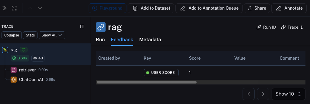 Once the feedback is logged, you can then see it associated with each run by clicking into the Metadata tab when inspecting the run. It should look something like this