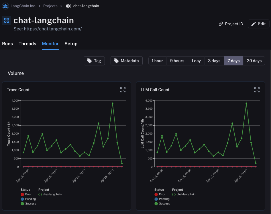 In production you likely have a LOT more traffic. So you don't really want to be stuck looking at datapoints one at a time. Luckily, LangSmith has a set of tools to help with observability in production.