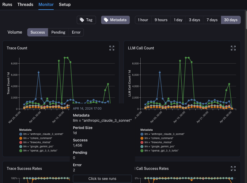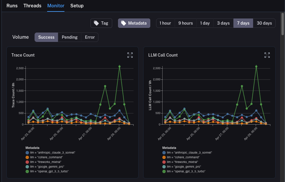 You can also use this tab to perform a version of A/B Testing. In the previous tutorial we starting tracking a few different metadata attributes - one of which was llm. We can group the monitoring charts by ANY metadata attribute, and instantly get grouped charts over time. This allows us to experiment with different LLMs (or prompts, or other) and track their performance over time.