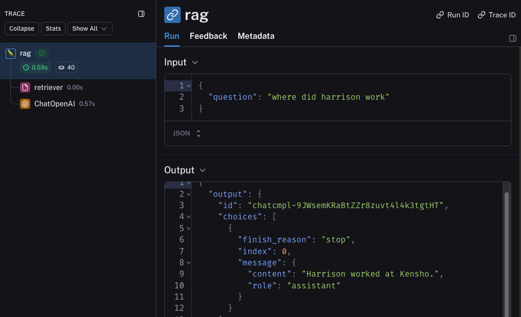 Notice we added @traceable(metadata={"llm": "gpt-4o-mini"}) to the rag function.